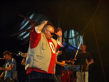 Zaraz po Motion Trio pojawił się zespół, na który czekałam przez cały festiwal. Leningrad!! Na scenie pojawiło się 13 osób!! Cała sekcja dęta, gitary, klawisze, bębny i ..... gość specjalny. Na samym środku sceny było miejsce nie dla wokalisty Siergieja Sznurowa, ale dla ważącego dobrze ponad 150 kilo wolnego obserwatora, który pełnił rolę perfomera. Rozbijał sobie na głowie puszki z piwem, demolował drewniane krzesła na scenie (w sumie cale 3 sztuki) i podśpiewywał piosenki wykonywane przez zespół.
