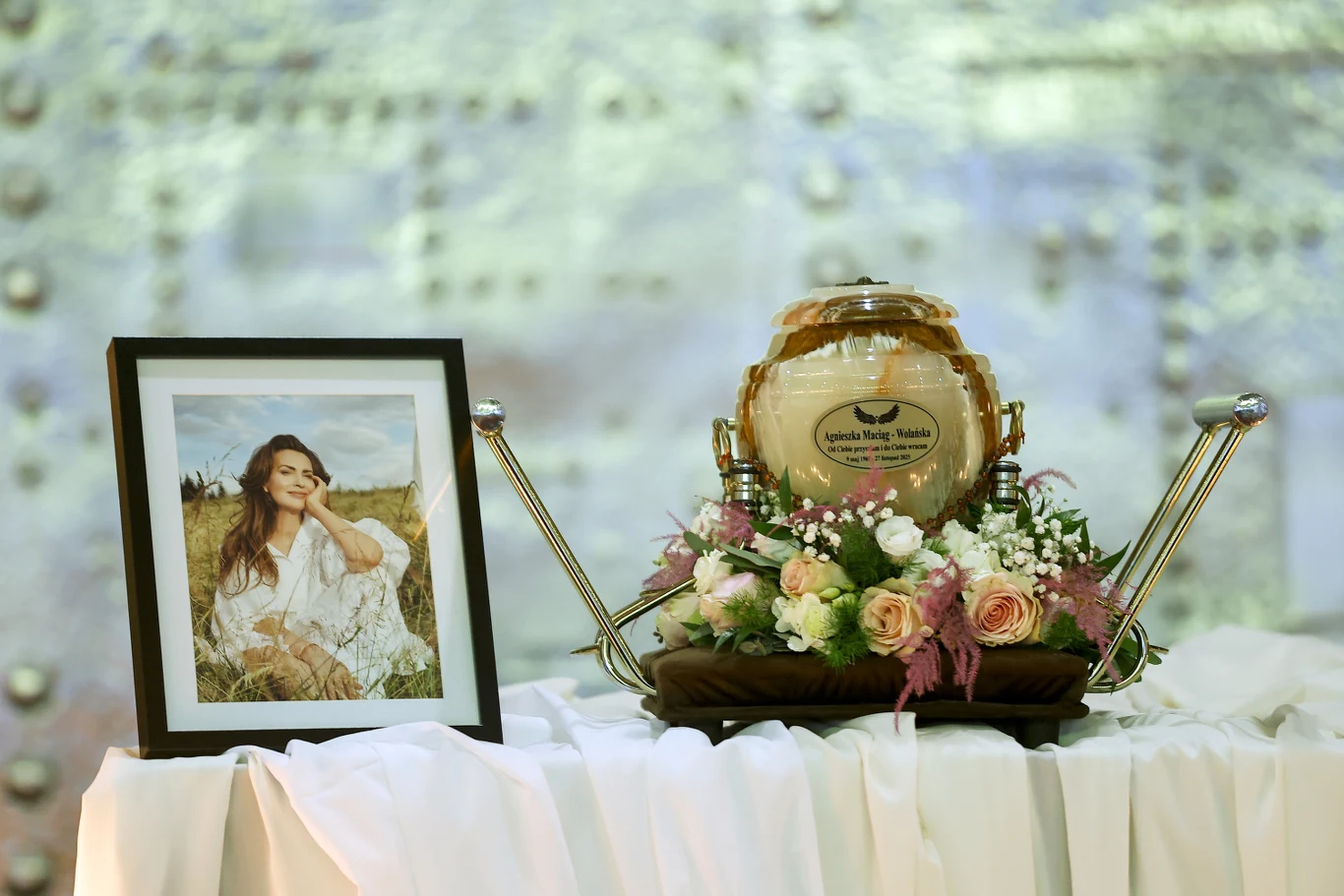 Zebrani przynieśli ze sobą białe róże. Prochy zmarłej umieszczone zostały w kremowo-beżowej urnie, którą na czas uroczystości ozdobiono jeszcze większą ilością kwiatów w pastelowych odcieniach. Obok ustawiono zdjęcie Agnieszki oraz białe świece. W trakcie uroczystości z głośników wybrzmiał jeden z utworów napisanych przez Maciąg - piosenka "Zatrzymaj czas".