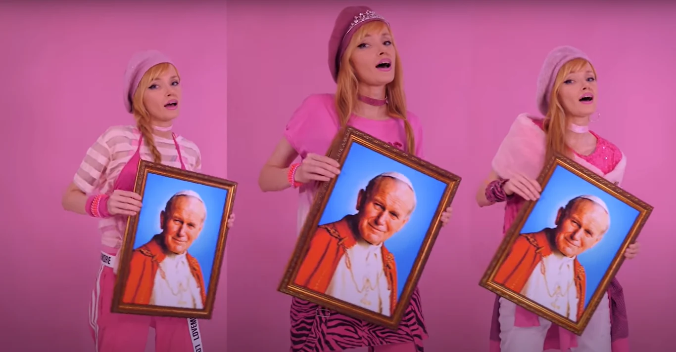 W niedawno zamieszczonym klipie performerka śpiewa o papieżu Janie Pawle II, a w ręku trzyma jego portret. "Potrojona" ADU śpiewa "jednych łączą social media / a innych jego energia / jego przekaz jego życie / jego serca dla nas bicie"
